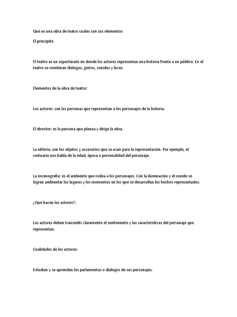Los actores hacen movimientos, ademanes, dicen diálogos, bailan o cantan, provocando la acción dentro de la obra. El teatro es una mezcla de recursos lingsticos y espectaculares, o lo que es lo mismo, el texto literario se suma, como un elemento ms, a los elementos escnicos pertinentes para conseguir un espectculo completo. A las 6 los amigos entraron en el vestíbulo del teatro. Es importante puesto que da a conocer la público en general el título de la obra que ha sido escrita y que se va a presentar. Teatro julio castillo del centro cultural del bosque.